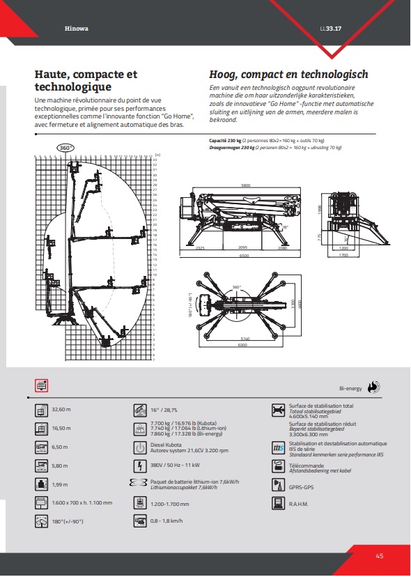 De Hinowa 33.17 is een kniktelescoop spinhoogwerker die ideaal is voor werkzaamheden op hoogte, zelfs op lastig terrein. Dankzij de rupsbanden is de machine uitstekend inzetbaar op oneffen of zachte ondergronden. In rijstand heeft deze spinhoogwerker een lengte van 6,50 meter en een breedte van 1,20 meter. De compacte afmetingen maken transport en manoeuvreren eenvoudig. De Hinowa 33.17 biedt drie verschillende stabilisatieopties: volledig gestabiliseerd, smal gestabiliseerd, of eenzijdig smal gestabiliseerd. Dit geeft flexibiliteit bij het opstellen in krappe of moeilijk bereikbare ruimtes. Deze spinrups levert uitstekende prestaties, met een maximale werkhoogte van 32,60 meter en een horizontale reikwijdte tot 16,50 meter. Dankzij de vernieuwde mastconstructie bereikt de machine een up and over-positie op een hoogte van 17 meter, wat het mogelijk maakt om over obstakels heen te werken. De werkbak heeft een draagvermogen van 230 kg en kan 180° roteren (+/-90°). Daarnaast is de werkbak afneembaar en voorzien van transportwielen, waardoor deze eenvoudig verplaatsbaar is. In transportpositie meet de machine 6,5 meter in lengte, 2 meter in hoogte en 1,2 meter in breedte, wat het vervoer over de weg of door nauwe doorgangen vergemakkelijkt.